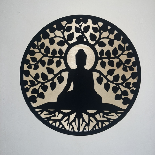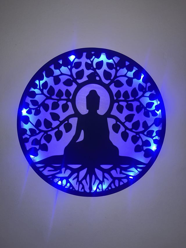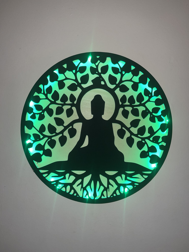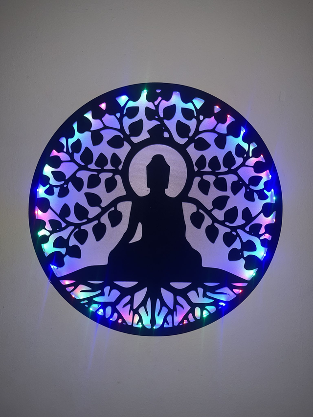 Tableau lumineux arbre de vie et bouddha en bois recyclé – Décoration murale LED upcycling