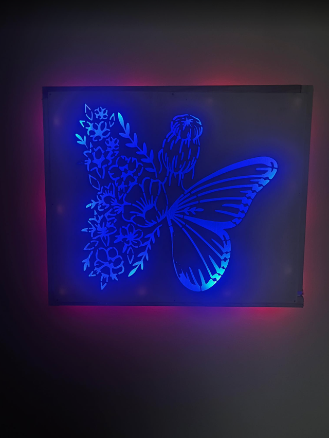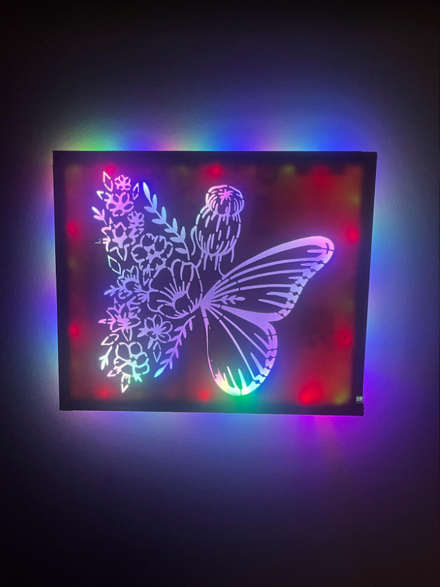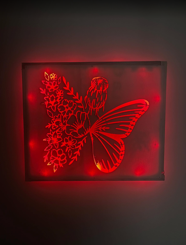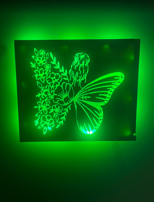 Tableau lumineux femme papillon fleurie couleur bois claire