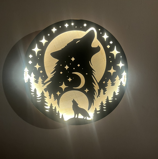 Tableau lumineux loup en bois recyclé – Décoration murale LED upcycling