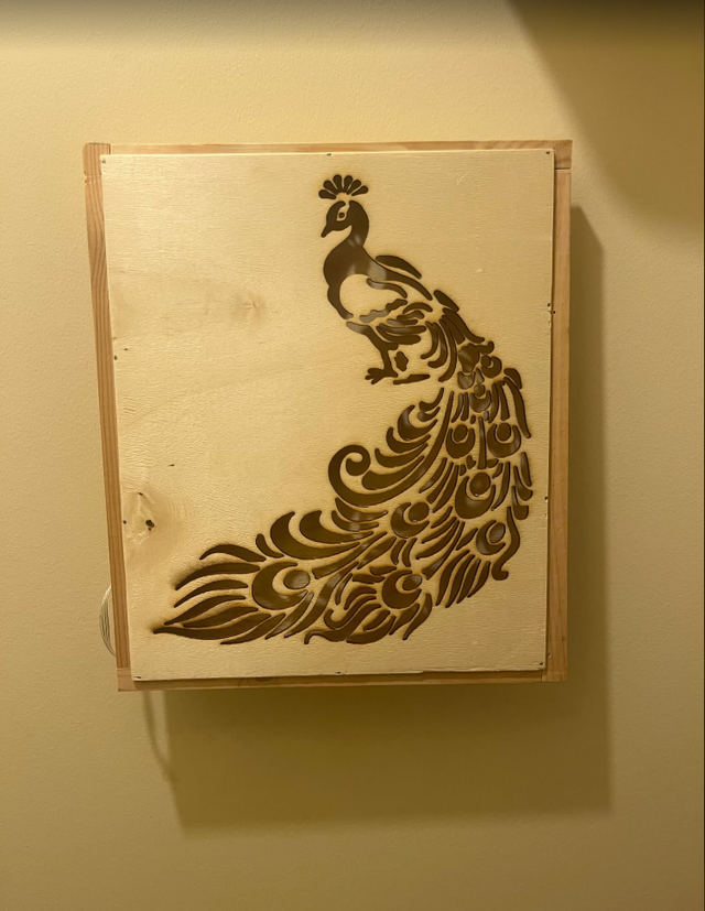 Tableau lumineux paon couleur bois claire.