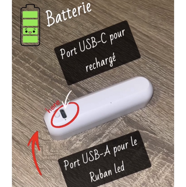 batterie : Li-ion 1200mAh (3,7V) entrée: 5V—-1A sortie :1.8W . normes CE autonomie six à 7h se recharge par le port USB C