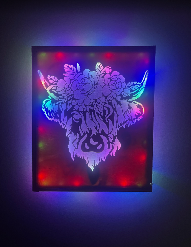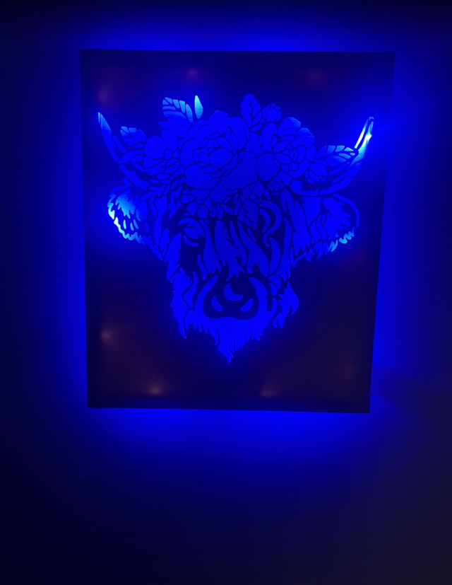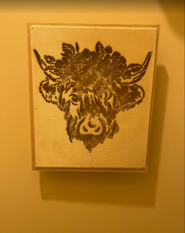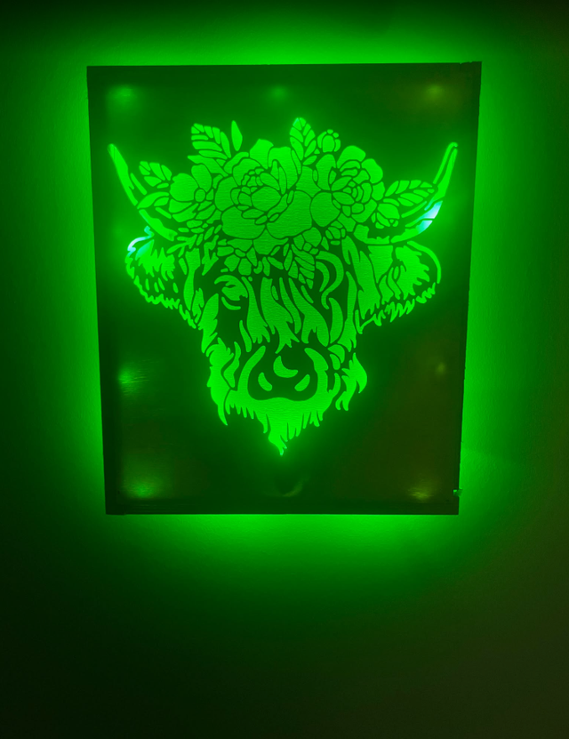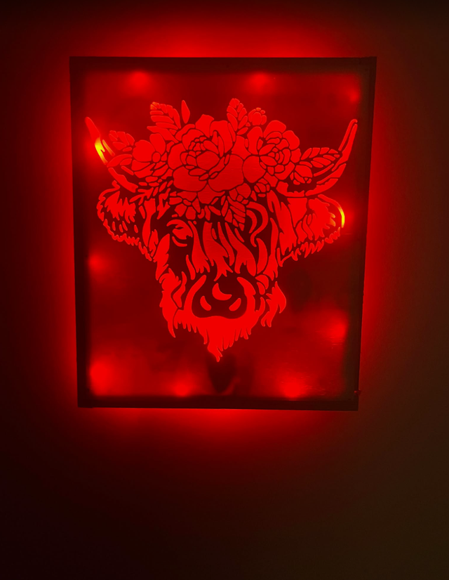 Tableau lumineux vache fleurie couleur bois claire.